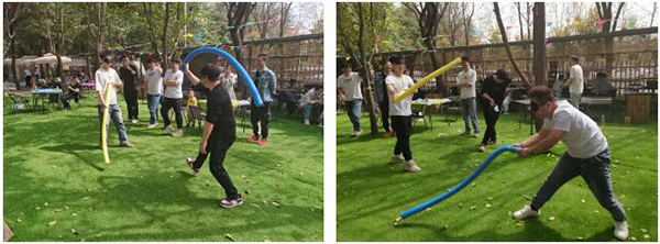 第三个游戏是蒙眼互打。每组各选出1位组员,选出的2人戴上眼罩后双方相隔3米并各自在原地转3圈后开战,只允许上下打不允许左右横扫,谁先打到对方即本轮获胜。共计玩3轮,取2胜为最终获胜。本场游戏的最终之战由追风组跟鲲鹏组的组长上场,场面精彩绝伦,引得在场众人哈哈大笑,最终顺利获得追风组组长的“连环攻击”取得本场游戏的胜利。